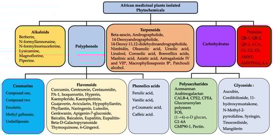 Although synthetic immunomodulatory drugs offer many advantages, their undesirable side-effect profile and broad impact on the entire immune system are significant limitations to the extended use of these drugs, justifying the search for more effective and safer agents with targeted immunomodulatory activity. Using natural substances as immunoadjuvants during vaccine development to enhance immunogenicity is very promising [12]. Previous studies have shown that natural products with immunomodulatory activity have already been used to treat autoimmune diseases, inflammatory disorders, and cancer [13]. These substances constitute a valuable source of biologically active secondary metabolites, including alkaloids, polysaccharides, terpenoids, flavonoids, coumarins, glycosides, and proteins. This review aims to compile a comprehensive database of molecules from African medicinal plants capable of modulating immunity and improve our knowledge of the potential signaling pathways.