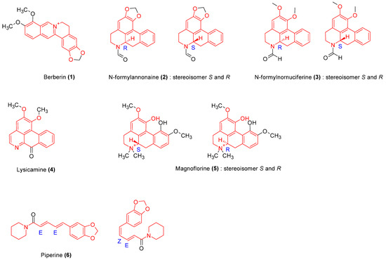 Structures of the identified alkaloids with immunomodulatory activities. The isolated alkaloids comprise a protoberberine isoquinoleic (1), aporphine isoquinoleine alkaloids (2–5), and a piperidine alkaloid (6). They have common scaffold highlighted in red. All have been tested and showed immunomodulatory activities.