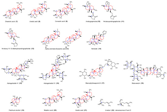 Structures of identified terpenoids with immunomodulatory activities. These terpenoids are distinguished in triterpenoid pentacyclic saponin (7, 8, 9, 13, 20, 21), lactone sesquiterpenoid (10, 11, 12), tetracyclic saponin heterosid (14, 15, 16, 17), pentacyclic saponin heterosid (18), diterpenoid (19) and Acyclic monoterpenoid (22). They have in common adjacent 2–5 rings, except for linalool (22). It is an advantage to have simple and complex structures like in linalool and beta-aescin (18), respectively, exhibiting immunomodulatory activities, which will lengthen the list of analogues.