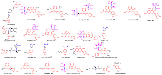 The structures of identified polyphenols acting as immunomodulators. The isolated polyphenols include flavonoids with the scaffold highlighted in red, polyphenolic acids with the acid group highlighted in blue, and ceto-phenolics. The thymoquinone is classed among polyphenols because in vivo metabolism gives phenolic compounds. The sugar group (highlighted in pink) is critical in the structure–activity relationship of flavonoids. Nevertheless, the active molecules have shown a similar way of modulating the immune system. They comprise phenol acid (38), cinnamic acid (23, 34–37), lignan (30), flavonols (25, 28, 39), flavones (33, 42, 43), flavanone (41), heterosid flavonols (24, 26, 27, 29, 31, 32, 40), heterosid flavones (33′, 44), and other phenolic compounds (45, 46).