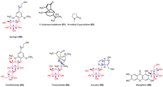 From medicinal plants, 86 molecules were isolated, 80 molecules were evaluated for their immunomodulatory proprieties (Table 1), and 56 had their structures represented (Figures 3–7).