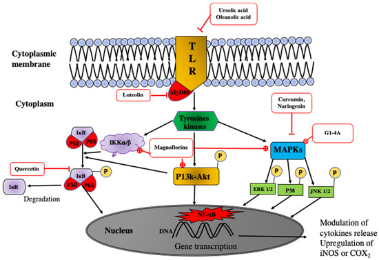 - Zhao, J.; Zheng, H.; Sui, Z.; Jing, F.; Quan, X.; Zhao, W.; Liu, G. Ursolic Acid Exhibits Anti-Inflammatory Effects through Blocking TLR4-MyD88 Pathway Mediated by Autophagy. Cytokine 2019, 123, 154726. [Google Scholar] [CrossRef] [PubMed]