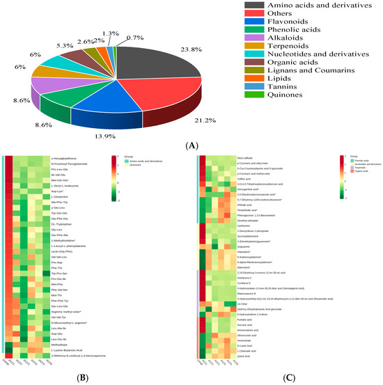 As shown in Figure 7A, the 151 differential NVMs included 36 amino acids and derivatives, 32 others (including sugars, ketones, aldehydes, alcohols, and vitamins), 21 flavonoids, 13 phenolic acids, 13 alkaloids, 9 terpenoids, 9 nucleotides and derivatives, 8 organic acids, 4 lignans and coumarins, 3 lipids, 2 tannins, and 1 quinone. To comprehensively analyze the changes in key differential metabolites caused by different processing methods, heatmaps of the 151 differential metabolites were obtained by classification (Figure 7B–E).