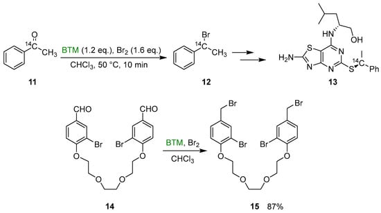 Some useful exploitations of the synthetic method were (Scheme 5) the synthesis of the 14C labeled benzylbromide 12, intermediate in the synthesis of CX3CR1 antagonist 13 [], and the synthesis of the dibromide derivative 15, intermediate in the synthesis of crownophanes [].