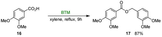 At room temperature, carboxylic acids are inert in presence of BTM and can be used as solvent in the reduction reactions; on the other hand, refluxing a xylene solution of BTM and carboxylic acid 16 in molar ratio of 1.5:2, ester 17 was isolated in 87% yield [] (Scheme 6); the reaction was suitable both to aliphatic and aromatic acids with moderate to good yields (28–87%).