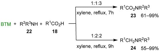 By adding either primary or secondary amine 22 to the previous reaction mixture and changing the ratio of the reagents, a different result was obtained (Scheme 8) []: with the molar ratio BTM:amine 22:acid 18 = 1:1:3 led to amide 23, seemingly by the action of acylating complex 20; instead, the molar ratio 1:2:2 led to the tertiary amine 24, likely by reduction of the acid 18 to an aldehyde equivalent (boryl acetal) followed by the reductive alkylation of amine 22.