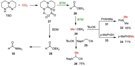Recently, the reduction of CO2 has emerged as a topic of great interest connected with global climate change and the urgent necessity to reduce the concentration of CO2 in the atmosphere through sequestration and its utilization in the synthesis of useful compounds. An early study [] reported the reduction of CO2 to formate by BTM weakly bonded to the bulkier Lewis acid Al(C6F5)3; then, the reaction mechanism was studied by quantum chemical calculations []. Subsequently, the reduction of CO2 was exploited for the selective monomethylation of 2-arylacetonitriles 25 []; as shown in Scheme 9, the optimized reaction conditions involved the reaction, in a sealed tube, of a DME solution of nitrile 25, tBuOK and 1,5,7-triazabicyclo[4.4.0]dec-5-ene (TBD) in an atmosphere of CO2, obtaining selectively the monomethyl derivative 26, with yields around 80% in almost all examples.