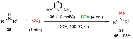 Recently, the selective methylation of amines with CO2 was examined [] by combining the organocatalyst 6-amino-2-picoline 36 and BTM (Scheme 11) to form a stable intramolecular frustrated Lewis pairs catalyst (Scheme 12), most of the secondary amines 35 used were N-alkyl or N-aryl anilines, with only two examples of alkyl heterocyclic amines, affording methylation products 37 in moderate to good yields.