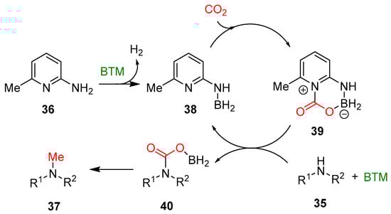 On the basis of a series of control experiments, NMR and high-resolution mass spectrometry (HRMS) analyses, a possible reaction mechanism was proposed (Scheme 12). The first step is the reaction of 6-amino-2-picoline 36 and excess BTM leading to aminoborane 38, with the quantitative evolution of H2, followed by the CO2 activation with zwitterionic intermediate 39. The next steps are less evident, and the authors speculate the formation of intermediate 40 that is further reduced to product 37.