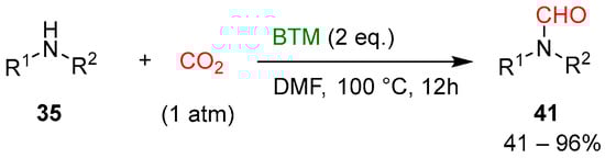 Without a catalyst, halving the equivalents of BTM and with DMF as solvent (Scheme 13), the reduction afforded the corresponding monoformylation products 41, an intermediate hypothesized in the reduction from 40 to product 37 (Scheme 12); most of the amines 35 used were primary anilines and yields were generally good.