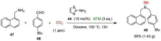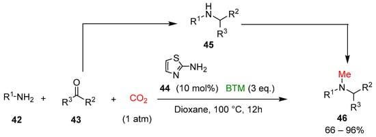Finally, a tandem four-component reductive methylation of primary amines 42 was realized, coupling a reductive amination to secondary amines 45, with the reduction of CO2 to a methyl group, synthesizing tertiary N-methylamines 46 [] (Scheme 14).