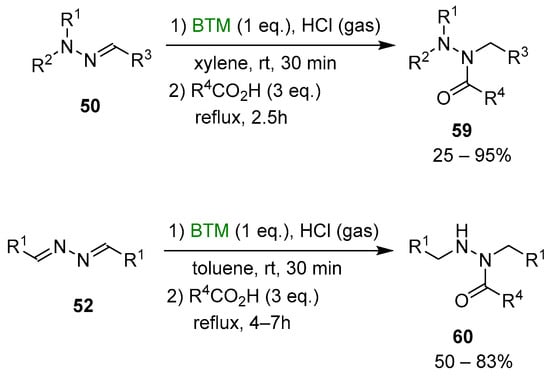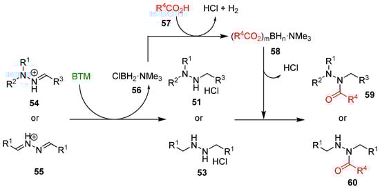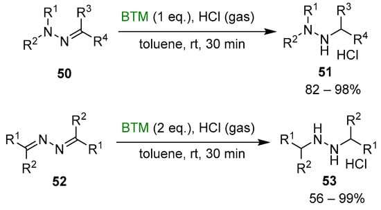 Although the reduction of hydrazones and azines is hampered by opposite conjugation effects, the presence of an acid in the reaction medium can activate the C=N bond to the attack of nucleophiles [,]. The improved stability of BTM in a strong acidic medium enabled the efficient reduction of both hydrazones 50 and azines 52 (Scheme 16), affording a wide range of highly functionalized mono-, di- and trialkyl hydrazines as stable and safe hydrochlorides and in excellent yields for most of the compounds.