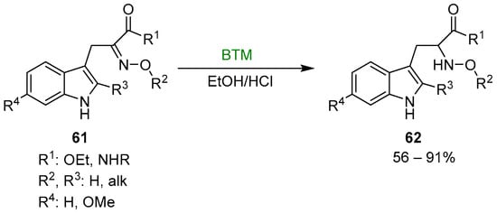 Early studies on the reduction of oximes by BTM and HCl were directed to the synthesis of N-hydroxy derivatives of tryptophan 62 (Scheme 19), useful intermediates for the synthesis of β-Carbolines [,,,], fungal metabolites Neoechinulins [,] and recently the marine fungal metabolite raistrickindole A [] (Scheme 20); with some oximes the reduction of indole to indoline (see Section 3.3) was observed [].