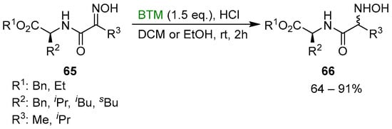 Subsequently, the synthetic method was extended to the synthesis of a new type of pseudopeptides, the N-hydroxy dipeptides 66 [], as a diastereoisomeric mixture (Scheme 21).