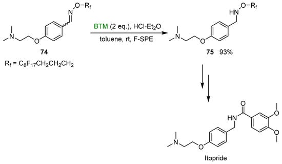 Finally, a new fluorous-tagged hydroxylamine [], as an ammonia equivalent, was successfully exploited in the synthesis of itopride, a drug used for the treatment of functional dyspepsia; the work-up step was simplified by fluorous solid-phase extraction (F-SPE), relative with this strategy (Scheme 24).
