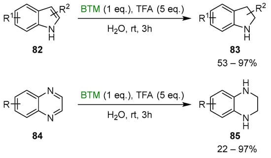 Trifluoroacetic acid (TFA), as an acidic activator, offered several opportunities; both indoles 82 and quinoxalines 84 [] were reduced to indolines 83 and tetrahydroquinoxalines 85, respectively, in water as solvent (Scheme 26).