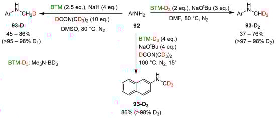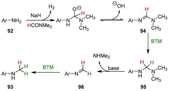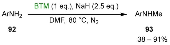 Primary anilines 92 were selectively monomethylated [] by reaction with BTM and NaH in DMF (Scheme 29).