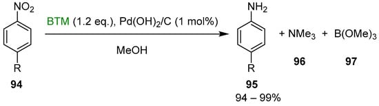 Of the various known complexes, BTM is the most stable [], less sensitive to hydrolysis, even under acidic conditions [], and does not require any special storage conditions. It is thermally stable up to 120 °C and can be purified by vacuum sublimation; conversely, ammonia–borane complex explodes when heated, and an attempted distillation of borane–pyridine complex at reduced pressure resulted in violent decomposition []. BTM is very soluble in a wide variety of solvents [], and its stability significantly increases with increasing solvent polarity []. It is relatively inexpensive compared with the other amine–borane complexes commercially available and considering the low molecular weight. Contrarily to borane complexes of ammonia, primary and secondary alkylamines, the inert nature of trimethylamine in BTM was a further advantage in avoiding the side reactions observed with the more reactive amines. Its reactivity can be opportunely activated in the reaction medium, and it is considered a valuable reagent in organic synthesis for laboratory as well as industrial scale. Since 1937, when it was synthesized for the first time, its applications have grown steadily, with some innovative ones in recent years.
