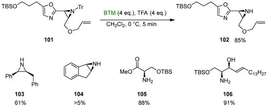 BTM reduced pyridines 76 (Scheme 25), activated by reaction with phenyl chloroformate, to 1,4 dihydropyridine 77 (majority product) and 1,2 dihydropyridine 78 (minority product) []; the use of triflic anhydride improved the regioselectivity toward dihydropyridine 77 reaching, in the best case, the 99:1 regioselectivity and 76:24 for the worst case. Substituents in the 4-position completely inverted the selectivity in favor of regioisomer 78. The reaction could also be applied for the synthesis of other N-heterocycles, such as dihydroquinolines 79, dihydroisoquinolines 80 and benzothiazoline 81, among others.