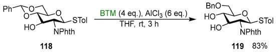 - Sherman, A.A.; Mironov, Y.V.; Yudina, O.N.; Nifantiev, N.E. The presence of water improves reductive openings of benzylidene acetals with trimethylaminoborane and aluminium chloride. Carbohydr. Res. 2003, 338, 697–703. [Google Scholar] [CrossRef] [PubMed]
