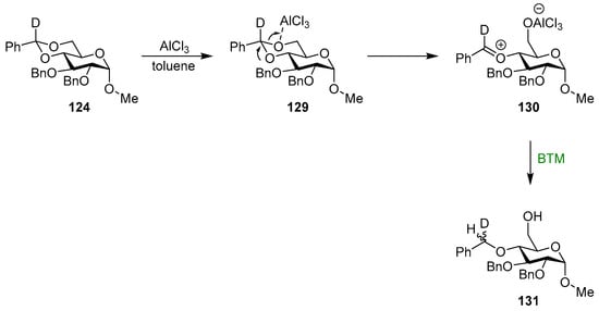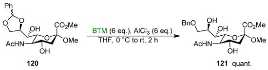 - Johnsson, R.; Ohlin, M.; Ellervik, U. Reductive openings of benzylidene acetals revisited: A mechanistic scheme for regio- and stereoselectivity. J. Org. Chem. 2010, 75, 8003–8011. [Google Scholar] [CrossRef] [PubMed]
