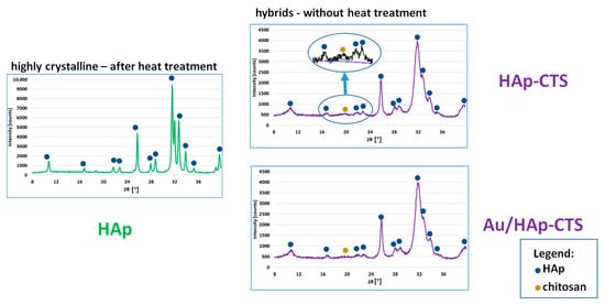 Figure 1 shows diffractograms of inorganic (HAp) and hybrid (HAp-CTS and Au/HAp-CTS) granules. Phase composition studies showed that the granules consisted of hydroxyapatite as the only crystalline phase (see also supplementary materials). Heat-treated granules were highly crystalline, as evidenced by the narrow reflexes; meanwhile, hybrids revealed wide reflexes from non-stoichiometric hydroxyapatite []. Additionally, an amorphous halo originating from chitosan in the diffractograms of the hybrid granules could be noticed, similar to the results of other works [,]. The modification of the granules with CA or PEG did not alter their phase composition.