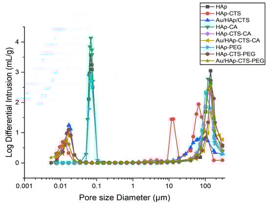 Specific surface area results were consistent with those obtained from mercury porosimetry. The pore size distribution chart is presented in Figure 3. Hydroxyapatite (HAp) granules, both unmodified and subjected to modifications, exhibit distinctive pore size distributions. The unmodified HAp granules display a bimodal distribution, featuring pores in the range of 0.05–0.10 µm and larger gaps between the granules, typically measuring 50–300 µm, as observed in the penetrometer. In the context of HAp-CTS granules, a more intricate trimodal pore size distribution emerges, encompassing ranges of 0.005–0.02 µm, 9–19 µm, and 40–174 µm. The first two ranges are associated with actual pores, with the center range potentially indicative of larger chitosan aggregates that may serve as conduits for substance diffusion or spaces for cellular infiltration []. Upon CA modification, the center range in HAp-CTS granules diminishes, and the third range shifts towards higher values, suggesting the possibility of chitosan washout or crosslinking. In the case of PEG-modified HAp-CTS granules, the first range shifts to 0.005–0.03 µm, accompanied by a notable increase in the abundance of those pores. These mesopores, implicated in molecular-level interactions, may play a pivotal role in processes such as adsorption and other surface-related phenomena. For Au/HAp-CTS granules, the pore size distribution mirrors that of PEG-modified HAp-CTS aggregates concerning the first range (0.005–0.02 µm). The second range, 50–300 µm, was low and broad. Upon CA modification of the gold-enriched granules, the first range remains unchanged, while the second range shifts to higher values, mirroring observations in non-Au-containing granules. PEG modification of Au/HAp-CTS granules yields a bimodal distribution akin to HAp-CTS-CA, with ranges of 0.005–0.02 µm and 50–300 µm.