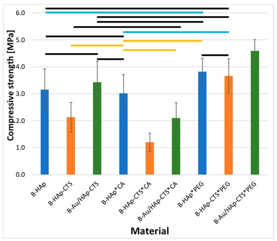 Compressive strength of the developed biomicroconcretes (significance bars meaning—black: not significant, blue: p < 0.1, orange: p < 0.05, without any bar: p < 0.01).