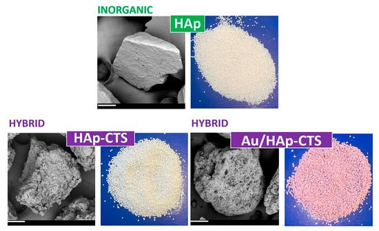 In this study, three types of granules—inorganic HAp, hybrid HAp-CTS, and hybrid with gold Au/HAp-CTS (Figure 6)—were developed and modified in two ways. The process of the granules’ preparation is described below.
