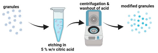 To modify the surface of the granules, a 5.0% aqueous solution of citric acid (Chempur, Piekary Slaskie, Poland) was used (Figure 7). After 5 min, the granules were centrifuged and washed four times with distilled water to remove residual acid and dried at 40 °C. The modified granules were named HAp*CA, HAp-CTS*CA, and Au/HAp-CTS*CA.