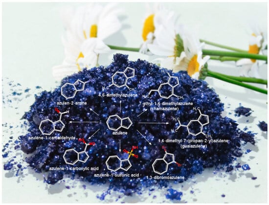Contemporary dermatology constantly seeks innovative solutions that can effectively improve the quality of life for patients suffering from various skin disorders. One promising avenue of research is the application of azulene and its derivatives in the therapy of dermatological diseases. Azulene, characterized by its distinctive blue color, is composed of a seven-membered cycloheptatriene ring fused with a five-membered cyclopentadiene ring, unlike its colorless isomer—naphthalene. Azulene is mainly found in natural essential oils of plant origin including Matricaria chamomilla L. (M. chamomilla), Achillea millefolium L. (A. millefolium), and Guaiacum officinale L. (G. officinale). G. officinale also contains chamazulene and guaiazulene. Other derivatives of azulene include methyl (7-isopropenyl-4-methylazulen-1-yl) stearate found in the fungus Lactarius indigo (L. indigo) and 7-acetylo-1,4-dimethylazulene present in the fungus Entoloma hochstetteri (E. hochstetteri) as well as 2,3-dihydrolinderazulene and linderazulene in marine invertebrates—gorgonians Acalycigorgia sp. [,,,,,]. In recent years, we have observed increased interest among researchers in azulene and its derivatives, particularly in the context of dermatological disease therapy. Basic modifications involve the substitution of hydrogen in the azulene structure with an appropriate substituent. The most common substituents include alkyl groups such as methyl (-CH3), ethyl (-C2H5), or isopropyl (-C3H7) as well as alkoxyl groups such as methoxyl (-OCH3), halogens, and functional groups such as amino (-NH2), carboxyl (-COOH), aldehyde (-CHO), hydroxyl (-OH), or others (Figure 1) [,,,,,,].