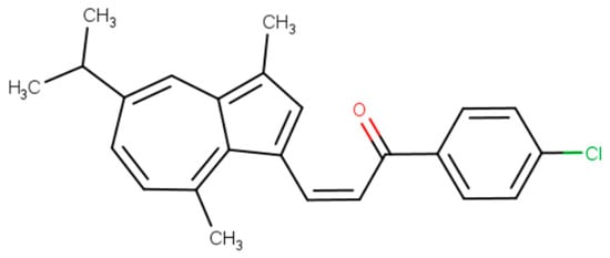 Zongchen Ma et al. synthesized derivatives of guaiazulene and examined them for anti-inflammatory activity. A series of chemical compounds—sulfonamides and chalcones based on guaiazulene—were utilized in the study. The experiment was conducted using a fluorescent macrophage transgenic model of Danio rerio (D. rerio), 3 days post-fertilization, with indomethacin as a positive control. Sulfonamide derivatives did not exhibit satisfactory anti-inflammatory activity, although sodium guaiazulene sulfonate is used in clinical practice [,]. On the other hand, guaiazulene-based chalcones exhibited significant anti-inflammatory activity, especially the compound presented in Figure 3, which showed a degree of inhibition of the inflammatory response in the zebrafish model at approximately 34%, surpassing the efficacy of indomethacin (approximately 27%) as a positive control. Additionally, a considerable reduction in the migration of inflammatory cells was observed after treatment with guaiazulene-based chalcones. These results suggest that the proposed compounds are promising candidates for further research as potential anti-inflammatory drugs [].