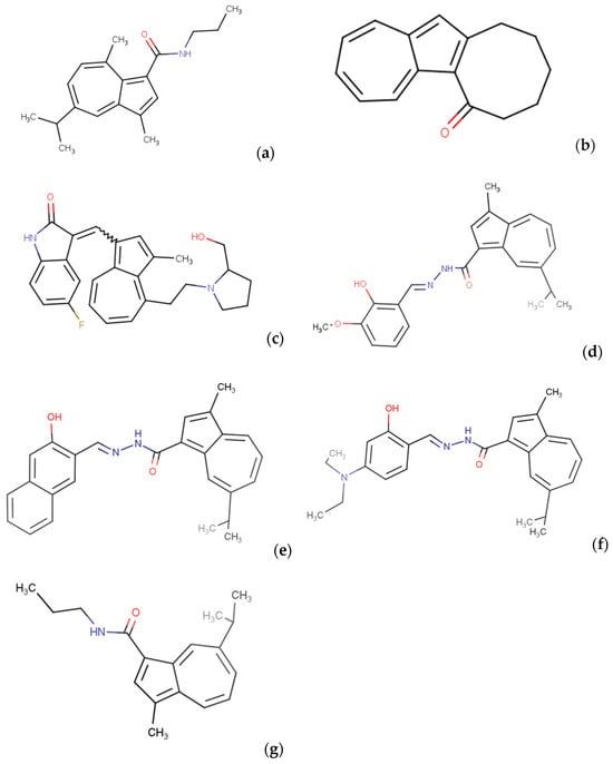 Structural formula of 3,8-dimethyl-5-(propan-2-yl)-N-propylazulene-1-carboxamide (a); 6H,7H,8H,9H,10H,11H-cycloocta[a]azulen-6-one (b); 5-fluoro-3-[(4-{2-[2-(hydroxymethyl)pyrrolidin-1-yl]ethyl}-3-methylazulen-1-yl)methylidene]-2,3-dihydro-1H-indol-2-one (c); N′-[(E)-(2-hydroxy-3-methoxyphenyl)methylidene]-3-methyl-7-(propan-2-yl)azulene-1-carbohydrazide (d); N′-[(E)-(3-hydroxynaphthalen-2-yl)methylidene]-3-methyl-7-(propan-2-yl)azulene-1-carbohydrazide (e); N′-[(E)-[4-(diethylamino)-2-hydroxyphenyl]methylidene]-3-methyl-7-(propan-2-yl)azulene-1-carbohydrazide (f); and 3-methyl-7-(propan-2-yl)-N-propylazulene-1-carboxamide (g), which are azulene derivatives with potential anticancer activity.