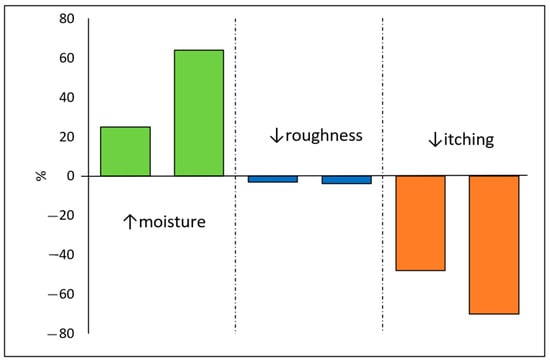 Assessment of skin moisture, roughness, and itching after 2 (A) and 4 (B) weeks of using guaiazulene with ceramides.