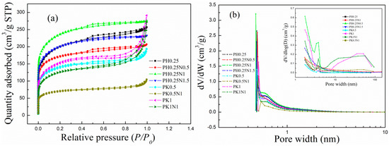 (1) N2 adsorption–desorption. The N2 adsorption–desorption isotherms and pore size distribution curves for the H3PO4– and KOH–activated poplar leaves before and after N-doping are shown in Figure 1a,b, respectively. As shown in Figure 1a, in the initial stage of increasing partial pressure, the N2 adsorption of the characterized ACs sharply increased, which is an indication of the existence of a large number of micropores [20,55]; as the relative pressure continuously increased, the N2 adsorption slowly increased, and hysteresis loops appeared in the final stage, suggesting that mesopores also appeared in the activated poplar leaves [26,27]. In other words, both micropores and mesopores appeared in the poplar leaf-based ACs. From the pore size distribution curves in Figure 1b, the micropore size is mainly less than 1 nm, which is favourable for the physical adsorption of CO2 [19,43]. The textural pore properties of the activated poplar leaves are shown in Table S1. As suggested in Table S1, the activated poplar leaves before and after N-doping had large specific surface areas and pore volumes ranging from 416–846 m2/g and 0.16–0.45 cm3/g, respectively. For H3PO4–activated poplar leaves, especially PH0.25N1, the pore properties, such as the specific surface area and pore volume, exhibited greater advantages than did those of KOH-activated poplar leaves.