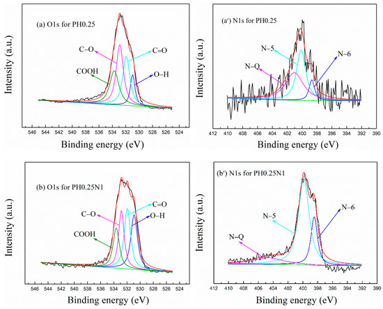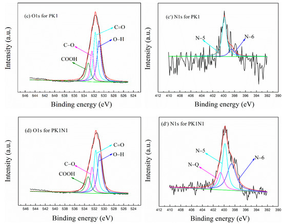 The XPS spectra for O1S and N1S of the H3PO4– and KOH-activated poplar leaves before and after N-doping are shown in Figure 2a–d and Figure 2a′–d′, respectively, and the peak area ratios of the O and N species are shown in Table S2 and Table S3, respectively. As shown in Figure 2a–d and Table S2, the total ratios of –OH and C–O for PH0.25 and PH0.25N1 are 11.04% and 10.21%, respectively, and the corresponding values for PK1 and PK1N1 are 24.47% and 18.74%, respectively; N-doping slightly reduces the amount of oxygen-containing functional groups, which may be caused by competition and interaction with nitrogen-containing functional groups. By comparison, the KOH–activated poplar leaves exhibited greater advantages in terms of oxygen-containing functional groups than the H3PO4–activated poplar leaves.