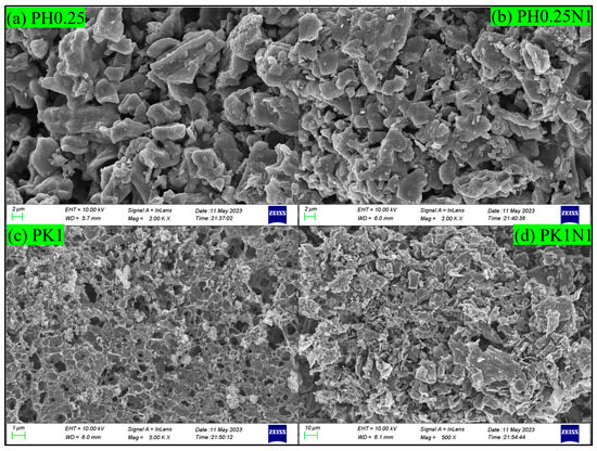 The surface morphology images of the H3PO4– and KOH–activated poplar leaves before and after N-doping are shown in Figure 3a–d. As shown in the Figures, the activation and N-doping of the poplar leaves led to the formation of developed and irregular pores. As shown in Figure 3a,b, the pores in PH0.25 are coarse and more developed and layered. As shown in Figure 3c,d, the KOH-activated poplar leaves formed dense and nearly circular pores, and after further N-doping, the pore surfaces were destroyed and became more disordered. By comparison, the surface morphology of the H3PO4–activated poplar leaves before and after N-doping was more suitable for CO2 adsorption, and the characterization results were consistent with those of the BET characterization. The differences in the pore structure and surface morphology between H3PO4 and KOH activation were mainly attributed to the activation mechanism and corrosiveness of H3PO4 and KOH.