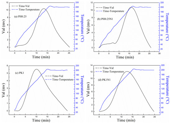 The CO2-TPD curves for the H3PO4– and KOH–activated poplar leaves before and after N-doping are displayed in Figure 4a–d, which demonstrate the CO2 desorption condition, and the initial adsorption temperature of the samples was set to 20 °C. As shown in Figure 4, as the temperature increased, the desorption phenomenon gradually appeared and became obvious at relatively low temperatures, suggesting that the adsorption process was mainly based on physisorption. However, the curve peaks for the studied sorbents all appeared at nearly 200 °C, which indicates that chemisorption was also involved in the adsorption process. The physisorption was mainly due to the narrow micropores and the hydrogen-bonding interactions between CO2 and the O- or N-containing functional groups, and the chemisorption was mainly due to the reaction between the pyrrolic nitrogen functional groups and CO2.