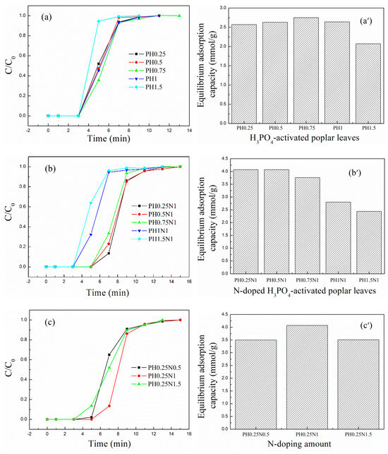 (a–e) CO2 breakthrough adsorption curves and (a′–e′) equilibrium adsorption capacities of H3PO4– or KOH–activated poplar leaves before and after N-doping.