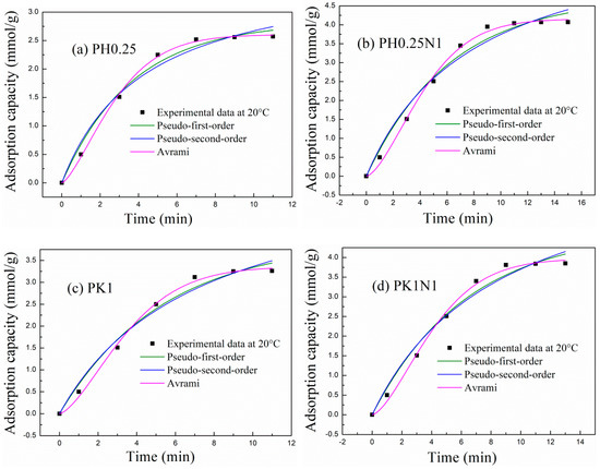 Adsorption kinetics are also important indices for evaluating the adsorption properties of an adsorbent. The pseudo-first-order, pseudo-second-order and Avrami models were used to simulate the adsorption kinetics of H3PO4– and KOH–activated poplar leaves before and after N-doping. The fitting curves are shown in Figure 6, and the fitting parameters are shown in Table 1. From the fitting results, only the Avrami model was well fitted to the experimental adsorption capacities of PH0.25, PH0.25N1, PK1, and PK1N1. The variance in R2 ranged between 0.9948 and 0.9982, and na ranged between 1.4272 and 1.5571, suggesting that the Avrami model is more suitable for describing the adsorption kinetics of poplar leaf-based ACs than the pseudo-first-order and pseudo-second-order models. Adsorption involves not only physisorption or chemisorption, but also a comprehensive adsorption process [27,28,33].