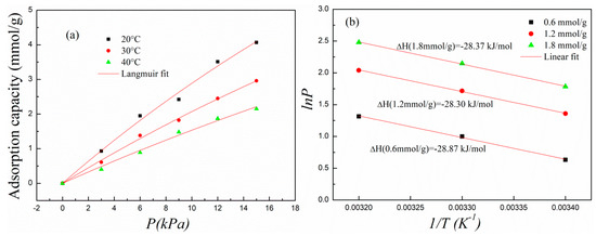 In view of the high adsorption capacity, PH0.25N1 was selected to further investigate the adsorption thermodynamic characteristics. The adsorption temperature and CO2 partial pressure were set as 20–40 °C and 0–15 kPa, respectively. The Langmuir adsorption isotherm equation was used to fit the experimental adsorption data, and the Clausius–Clapyron equation was used to calculate the isosteric heat of adsorption. Corresponding fittings are shown in Figure 7a,b, and the fitting parameters are shown in Table 2. As shown in Figure 7a and Table 2, the experimental data showed good fitting with the Langmuir equation, in which R2 ranged above 0.99, showing that the Langmuir model could describe the adsorption characteristic of PH0.25N1. In addition, the experimental data suggested good linear fitting with the Clausius–Clapyron equation, and the calculated isosteric heat of adsorption was almost 28 kJ/mol when the adsorption capacity ranged from 0.6 to 1.8 mmol/g, which is an indication that the adsorption of PH0.25N1 was mainly physisorption. As the adsorption temperature increased from 20 to 40 °C, the value of kL gradually decreased from 0.01316 to 0.00874, which is also a physisorption characteristic.