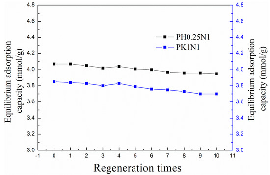 In view of their good adsorption performance, PH0.25N1 and PK1N1 were selected for further investigation of their regeneration performance. The adsorption temperature was 20 °C and the regeneration temperature was set to 200 °C according to the CO2-TPD results. The adsorption capacities after every regeneration for both samples are exhibited in Figure 9. As shown in Figure 9, the adsorption capacities of PH0.25N1 and PK1N1exhibited slight decreases during the ten regeneration cycles–3.95 and 3.70 mmol/g after the tenth regeneration, and were reduced by only 2.95 and 3.90%, respectively, compared with that of the fresh samples. The regeneration performance of the poplar leaf-based ACs was comparable to that reported in the related literature [30,33,50,51].