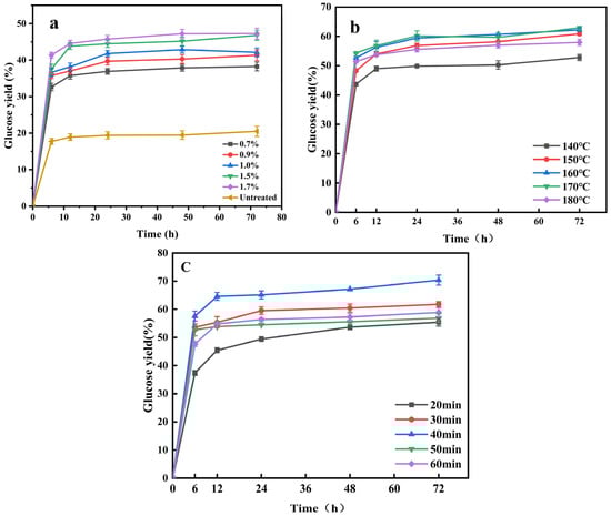 In order to study the enzymatic hydrolysis potential of the pretreatment products, the effects of different pretreatment factors (concentration, temperature, and time) in DA/E520 pretreatment on the enzymatic effect were investigated as shown in Figure 2. As shown in Figure 2a, the unpretreated corn stover had a glucose yield of 20.5% after 72 h of enzymatic digestion. This is because the stubborn structure of the corn straw resisted the degradation of cellulase. However, the results of concentration optimization showed that with the increase in aluminum sulfate, the glucose yield gradually increased. The pretreatment reaction removes little cellulose and most of hemicellulose, destroys the lignocellulosic structure and improves cellulase action with cellulose [27]. When concentrations of 0.7%, 0.9%, 1.0%, 1.5%, and 1.7% aluminum sulfate were added, the glucose yield reached 38.26%, 41.32%, 42.13%, 46.79%, and 47.26%. The maximum glucose yield was increased two-fold compared with the raw corn stover. The difference between the enzymatic yield at 1.5% and 1.7% was minimal.