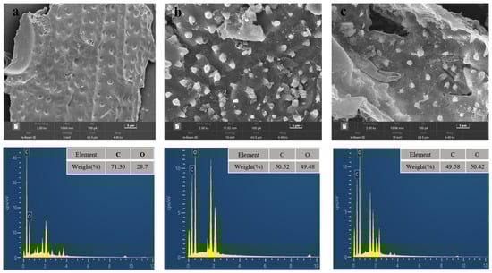 In order to understand the effect of pretreatment process on corn stover, some characterization methods such as SEM, FTIR, XRD, etc., have been applied to enhance the understanding of pretreatment. SEM-EDS maps of corn stover were analyzed and the results are shown in Figure 3. From the SEM, it can be seen that the surface of the corn stover was smooth, and the fibers were longitudinally and transversely intertwined to form a recalcitrant structure to prevent the degradation of cellulase [29]. After pretreatment, the surface of corn straw appeared to fold and hollow structure and many fine particles existed. This may be that a large amount of hemicellulose was removed during pretreatment and the dense structure was destroyed. With the end of the reaction, part of the lignin condensed on the surface, forming pseudo-lignin. The loose structure after pretreatment helps to improve the accessibility of cellulase, make cellulase easy to hydrolyze, and improve the hydrolysis efficiency [30].