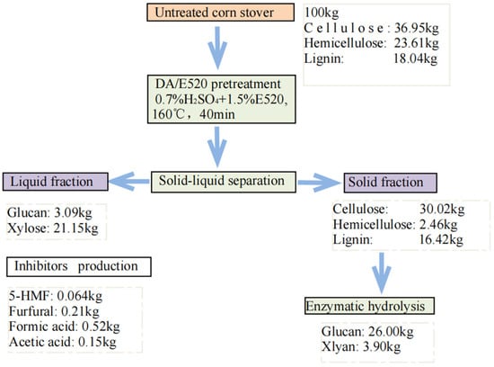 The mass balance was performed (optimum DA/E520 system (1.5% E520 addition, 160 °C and 40 min of treatment) for 100 kg of corn stover biomass and included values for cellulose, xylan, and lignin. The data in this analysis were obtained from the experimental results. The results of mass balance was shown in Figure 4. The raw materials mainly contain cellulose (36.95%), hemicellulose (23.61%), lignin (18.04%), and other components (21.40%). The results showed that 30.02 kg of cellulose (based on the initial untreated biomass) was retained in the solid fraction and approximately 3.09 kg of cellulose was hydrolyzed to glucose; and 16.42 kg of lignin and 2.46 kg of hemicellulose were still retained in the straw. The enzymatic digestibility of the cellulose solid fraction yielded a glucose yield of 26.0 kg, which means that 70.37% of the initial cellulose was converted to glucose. For lignin, the solid fraction of the biomass retained most of the lignin 16.42 kg. In addition, 21.15 kg of all quantities of xylose were extracted and dissolved in the liquid phase, with 2.46 kg retained in the solid fraction. The hydrolysis of hemicellulose in the liquid yielded 89.58% of total xylose. The remaining small fractions were degraded to inhibitors in the reaction, mainly furfural, formic acid, and acetic acid.