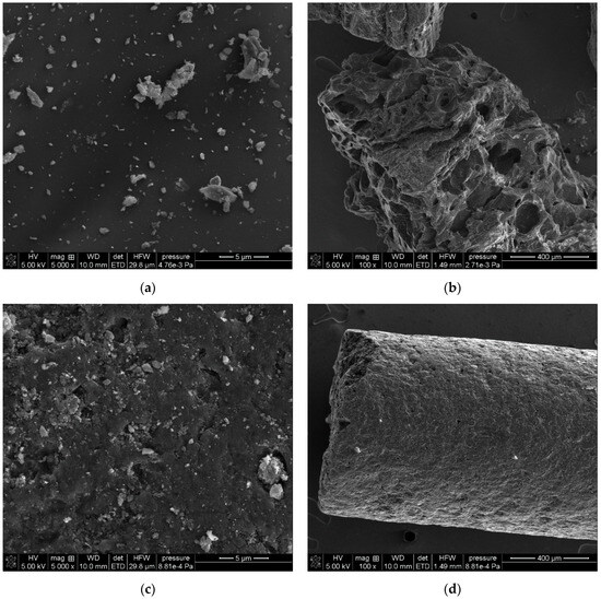 Scanning electron microscopy was used to estimate the morphological properties of the carbon adsorbents used. Figure 2 presents SEM micrographs for GAC and RIAA materials. As can be seen, RIAA carbon granules have a cylindrical and regular shape. However, the grains of GAC material have a significantly different form—highly irregular. Additionally, based on SEM micrographs, it can be observed that the activated carbons used for research have a strongly expanded porous structure.