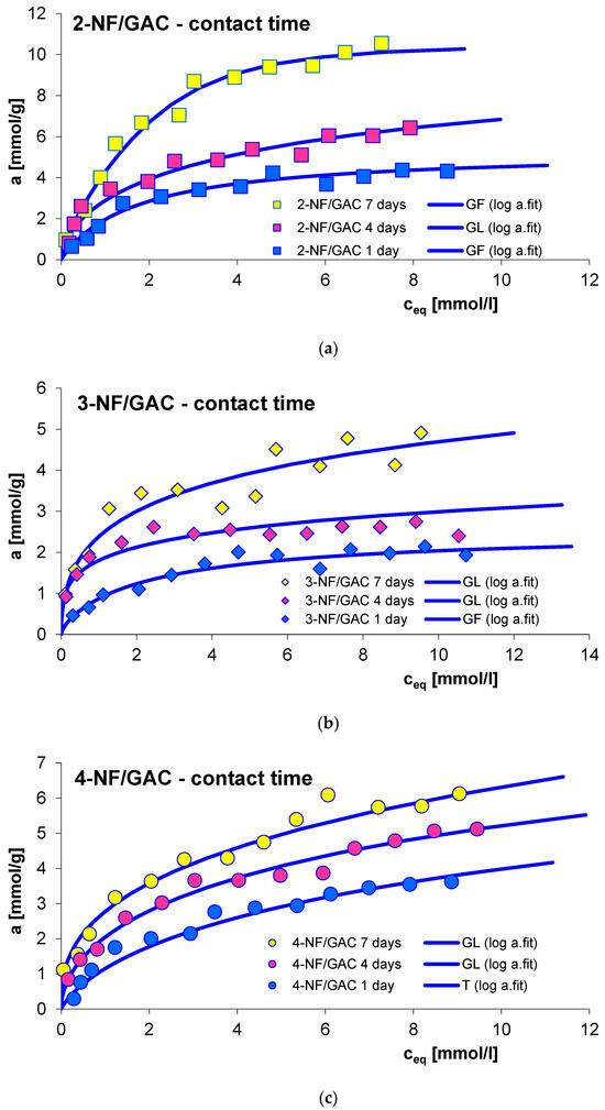 Another factor determining the adsorption effectiveness is the contact time of the adsorbate with the adsorbent. Generally, running the adsorption process for a longer period of time promotes the efficiency of this process. This effect was examined for adsorption of 2-, 3- and 4-nitrophenol (2-, 3- and 4-NF) on GAC 1240W (GAC) carbon. The adsorption processes were carried out for 1, 4 and 7 days. Figure 5 presents the obtained adsorption isotherms. As can be seen from the conducted research, an increase in the amount of adsorption was observed with the extension of the contact time of nitrophenols with GAC activated carbon. The obtained maximum adsorption values were 4.32–10.55 mmol/g, 2.14–4.91 mmol/g and 3.62–6.13 mmol/g for 2-NF, 3-NF and 4-NF, respectively. In the experimental systems tested, this effect was particularly visible, especially since the GAC material was characterized by a highly developed porous structure. Extending the contact time of the adsorbates allowed both adsorption on the surface active sites and penetration into the microstructure of the adsorbent [45,46].