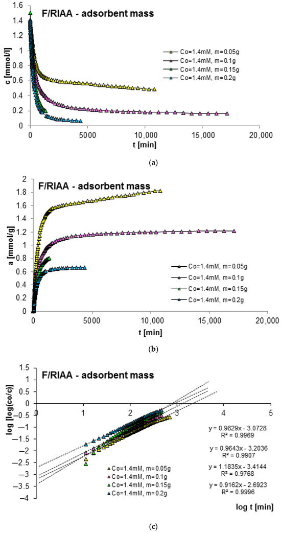 Comparison of the adsorption kinetics of F on RIAA activated carbon with constant adsorbent mass and variable initial adsorbate concentration presented in the profile of concentration changes over time (a), relative adsorption over time (b) and in Bangham’s linear coordinates (c).