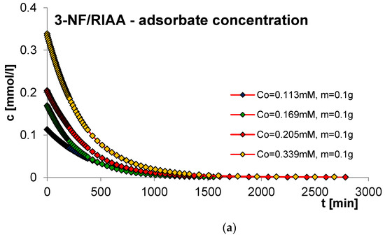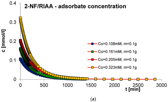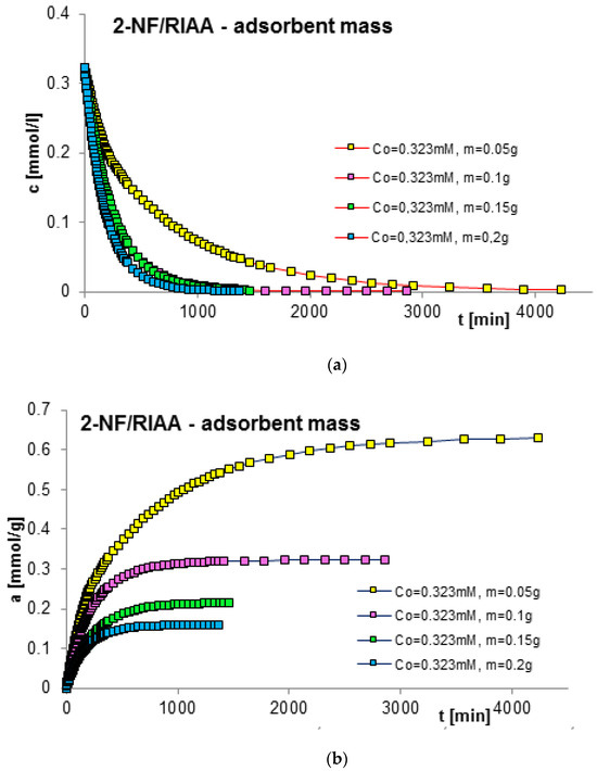 Additionally, it was shown that adsorption kinetics is higher in systems with higher adsorbent mass and adsorbate concentration. It was shown that, depending on the adsorbent weight used, the half-times ranged from 222.4–655.4 min, 117.2–340.6 min, 117.7–457.0 min and 154.2–553.5 min for the adsorption of F, 2-NF, 3-NF and 4-NF on RIAA carbon. As expected, the fastest adsorption was observed in the systems for which the highest mass of adsorbent was used. At the same time, in order to maintain economy and not to lose the effectiveness of the sorption process, it was determined that the optimal ratio of carbon mass to solution volume should be 1 g/L.