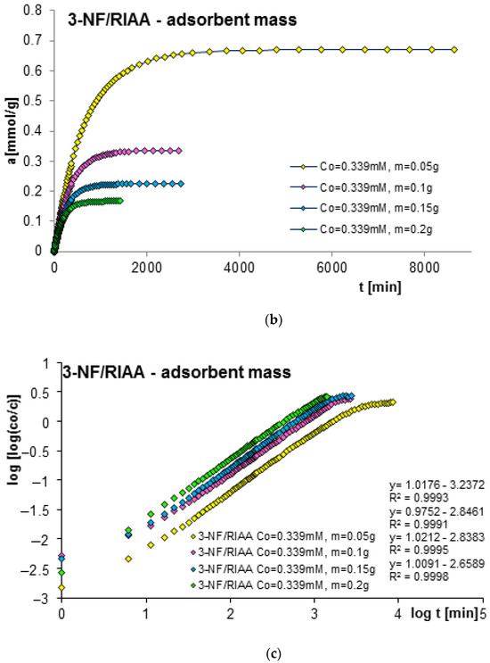 Comparison of the kinetics of adsorption of 3-nitrophenol (3-NF) on RIAA activated carbon at a constant initial adsorbate concentration and variable adsorbent mass presented in the profile of concentration changes over time (a), relative adsorption over time (b) and in Bangham’s linear coordinates (c).